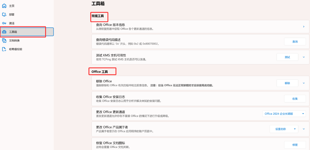 - 安装 Office 出现问题时,请根据提供的错误信息排查问题;更详细的错误信息可以在 【工具箱】->【收集 Office 安装日志】获得。